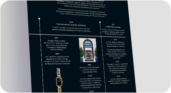 Since 1909, our entire business model has been designed to create and safeguard the conditions for creativity to thrive. Everything we do as a company is intended to support, enable, and feed creativity: the way we run the business, how we measure performance, our care for our people, and the way we protect and preserve our savoir faire. The history of CHANEL has always been one of disruption, of daring to think and act differently, of creating new trends. Here are some key examples of how CHANEL has set the trend for luxury over the past 100 years: 1978 2011 THE HOUSE OF CHANEL EXPANDS FONDATION CHANEL CHANEL introduces its first Ready-to-Wear collection CHANEL launches Fondation CHANEL and the worldwide distribution of its line of accessories. to support women as agents of social change throughout the world. 1981 2013 Jacques Polge is named CHANEL opens an extension in director of the Laboratoire Parfum Pantin, one of the most modern de CHANEL, following in the research centers in cosmetics. footsteps of Ernest Beaux and Henri Robert. Following the retirement of his father, Jacques, Olivier Polge 1983 becomes the director of Fragrance Karl Lagerfeld is appointed artistic Creation and Development director for CHANEL FASHION, for CHANEL. designer of all Haute Couture, Ready- 2016 to-Wear, and accessory collections. 1993 Through the launch of La MONTRE The first CHANEL fine jewelry MONSIEUR, CHANEL unveils its collection launches in first watch with a movement Place Vendôme, Paris. designed and manufactured completely in-house. 2000 2017 CHANEL launches the J12, the first watch with a case made out CHANEL launches the new of black ceramic, a high-tech GABRIELLE CHANEL FRAGRANCE material inspired from the field and GABRIELLE HANDBAG. of aeronautical engineering. 2002 Through its subsidiary Paraffection, 1987 CHANEL acquires eight traditional The first line of CHANEL Watches Parisian fashion ateliers, creating launches the PREMIÈRE WATCH, the Métiers d’Art show. designed by Jacques Helleu.