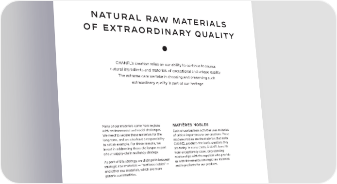 A CREATION-DRIVEN BRAND NATURAL RAW MATERIALS OF EXTRAORDINARY QUALITY CHANEL’s creation relies on our ability to continue to source natural ingredients and materials of exceptional and unique quality. The extreme care we take in choosing and preserving such extraordinary quality is part of our heritage. Many of our materials come from regions MATIÈRES NOBLES with environmental and social challenges. Each of our business activities uses materials We need to secure these materials for the of critical importance to our creations. These long term, and we also have a responsibility matières nobles are the materials that make to set an example. For these reasons, we CHANEL products the iconic creations they invest in addressing these challenges as part are today. In many cases, CHANEL benefits of our supply-chain resiliency strategy. from exceptionally close, long-standing As part of this strategy, we distinguish between relationships with the suppliers who provide strategic raw materials — “matières nobles” — us with the essential strategic raw materials and other raw materials, which are more and ingredients for our products. generic commodities.