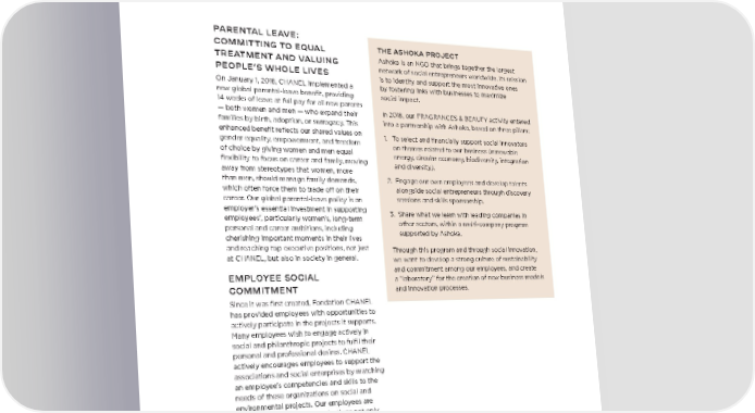 BEING A PURPOSEFUL EMPLOYER PARENTAL LEAVE: COMMITTING TO EQUAL THE ASHOKA PROJECT TREATMENT AND VALUING Ashoka is an NGO that brings together the largest PEOPLE’S WHOLE LIVES network of social entrepreneurs worldwide. Its mission is to identify and support the most innovative ones On January 1, 2018, CHANEL implemented a by fostering links with businesses to maximize new global parental-leave benefit, providing social impact. 14 weeks of leave at full pay for all new parents — both women and men — who expand their In 2018, our FRAGRANCES & BEAUTY activity entered families by birth, adoption, or surrogacy. This into a partnership with Ashoka, based on three pillars: enhanced benefit reflects our shared values on 1. To select and financially support social innovators gender equality, empowerment, and freedom on themes related to our business (renewable of choice by giving women and men equal energy, circular economy, biodiversity, integration flexibility to focus on career and family, moving and diversity). away from stereotypes that women, more than men, should manage family demands, 2. Engage our own employees and develop talents which often force them to trade off on their alongside social entrepreneurs through discovery career. Our global parental-leave policy is an sessions and skills sponsorship. employer’s essential investment in supporting 3. Share what we learn with leading companies in employees’, particularly women’s, long-term other sectors, within a multi-company program personal and career ambitions, including supported by Ashoka. cherishing important moments in their lives and reaching top executive positions, not just Through this program and through social innovation, at CHANEL, but also in society in general. we want to develop a strong culture of sustainability EMPLOYEE SOCIAL and commitment among our employees, and create a “laboratory” for the creation of new business models COMMITMENT and innovation processes. Since it was first created, Fondation CHANEL has provided employees with opportunities to actively participate in the projects it supports. Many employees wish to engage actively in social and philanthropic projects to fulfil their personal and professional desires. CHANEL actively encourages employees to support the associations and social enterprises by matching an employee’s competencies and skills to the needs of these organizations on social and environmental projects. Our employees are thereby helping these organizations not only with their time, but also by helping them build internal competencies in key disciplines for mutually rewarding benefit.