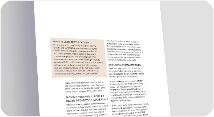 The whole idea of the circular economy WHAT IS LEED CERTIFICATION? is restorative and regenerative by design. LEED is a is an internationally recognized rating Relying on system-wide innovation, it aims system and certification standard devised by the to redefine products and services to phase USGBC for evaluating the environmental, health, out waste, while minimizing negative impacts. and safety performance of building design and Underpinned by a transition to renewable- construction projects, and encouraging market energy sources, the circular model builds transformation toward sustainable design. Projects economic, natural, and social capital. pursuing LEED certification earn points across several categories, including, but not limited to, energy REDUCING PMMA IMPACTS use and air quality. Based on the number of points Since 2014, our FRAGRANCES & BEAUTY achieved, a project then earns one of four LEED activity has taken a number of significant rating levels: Certified, Silver, Gold, or Platinum. steps to reducing the environmental impact of PMMA plastic in its SPM displays. approaches and guidelines most relevant to In 2014, we began using a recycled PMMA our small-scope luxury boutiques. We hope known as Green Cast in our cosmetic display these standards will be able to support other cases — an innovation by our supplier luxury brands seeking LEED certification. Madreperla. This increased the amount of recycled raw materials in our SPM by almost MOVING TOWARD CIRCULAR one-third, and according to life cycle analysis SALES PROMOTION MATERIALS conducted by EVEA, decreased its carbon footprint by 66 percent. While we work to improve our retail spaces, we are also finding ways to reduce the impacts In 2017, the activity launched the Pearl Project, of our product displays and other sales and working with our suppliers Madreperla and promotional materials (SPM) that appear Arkema to produce recycled PMMA granules within them. We are investing in the circular for manufacturing injection-molded SPM economy, the end goal being to phase out components. This project will at least double waste by regenerating materials and products the amount of recycled plastic in our SPM. at the end of their life cycle. To this end, we are progressively improving the eco-design of our SPM, increasing use of recycled raw materials and ensuring they can be recycled easily at the end of their lives.