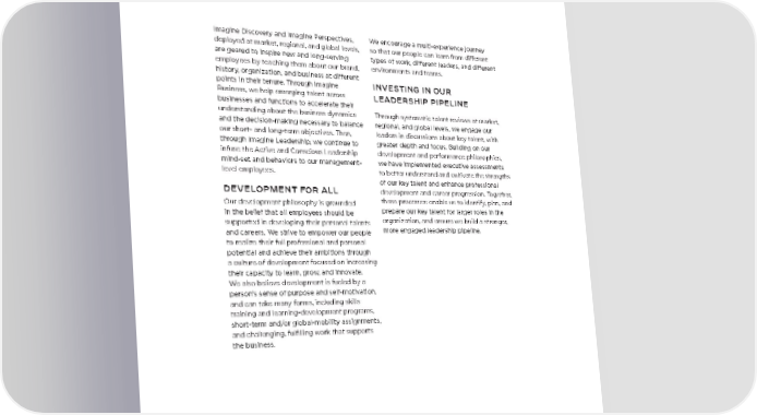 A HUMAN-DRIVEN COMPANY Imagine Discovery and Imagine Perspectives, We encourage a multi-experience journey deployed at market, regional, and global levels, so that our people can learn from different are geared to inspire new and long-serving types of work, different leaders, and different employees by teaching them about our brand, environments and teams. history, organization, and business at different points in their tenure. Through Imagine INVESTING IN OUR Business, we help emerging talent across LEADERSHIP PIPELINE businesses and functions to accelerate their understanding about the business dynamics Through systematic talent reviews at market, and the decision-making necessary to balance regional, and global levels, we engage our our short- and long-term objectives. Then, leaders in discussions about key talent, with through Imagine Leadership, we continue to greater depth and focus. Building on our infuse the Active and Conscious Leadership development and performance philosophies, mind-set and behaviors to our management- we have implemented executive assessments level employees. to better understand and cultivate the strengths of our key talent and enhance professional DEVELOPMENT FOR ALL development and career progression. Together, Our development philosophy is grounded these processes enable us to identify, plan, and in the belief that all employees should be prepare our key talent for larger roles in the supported in developing their personal talents organization, and ensure we build a stronger, and careers. We strive to empower our people more engaged leadership pipeline. to realize their full professional and personal potential and achieve their ambitions through a culture of development focused on increasing their capacity to learn, grow, and innovate. We also believe development is fueled by a person’s sense of purpose and self-motivation, and can take many forms, including skills training and learning-development programs, short-term and/or global-mobility assignments, and challenging, fulfilling work that supports the business.